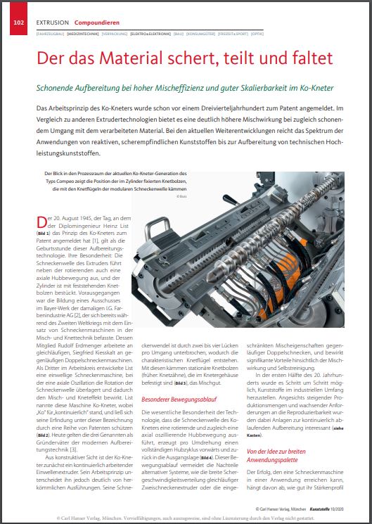 Mehr über die Besonderheiten der Ko-Kneter-Technologie, über die schonende Aufbereitung bei hoher Mischeffizienz und über die gute Skalierbarkeit des Ko-Kneters im Compoundierprozess lesen Sie in dem ausführlichen Fachaufsatz, der im Magazin „Kunststoffe“ des Carl Hanser Verlag, München, im Oktober 2020 erschienen ist. Die Autoren geben einen Einblick in das Verfahren und seine Vorteile. Sie erklären, wie sich die Compoundiertechnologie über die Jahrzehnte entwickelt hat, welchen besonderen Stellenwert sie in der Kunststoffindustrie heute als Allrounder sowie als erste Wahl für anspruchsvolle Aufbereitungsaufgaben hat. Und sie geben einen Ausblick, wie sich die Ko-Kneter-Technologie im Kontext der immer spezielleren Anforderungen in der Zukunft entwickeln wird.