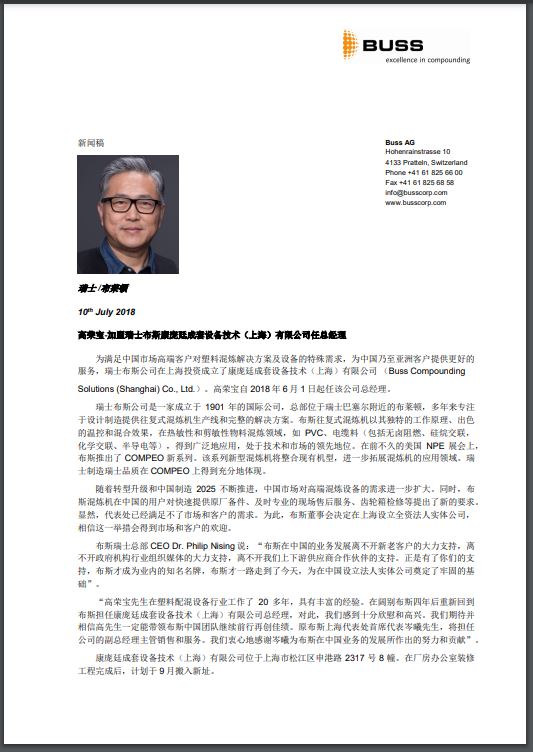 Um die besonderen Bedürfnisse für Compoundierlösungen von anspruchsvollen Kunden auf dem chinesischen Markt zu bedienen und seinen Kunden in China und dem übrigen Asien noch bessere Serviceleistungen zu bieten, hat die Buss AG eine eigene Tochtergesellschaft gegründet: die BUSS Compounding Solutions (Shanghai) Co., Ltd. in Shanghai. Seit dem 1. Juni 2018 hat Herr Rongbao Gao die Leitung des Unternehmens als Geschäftsführer übernommen.